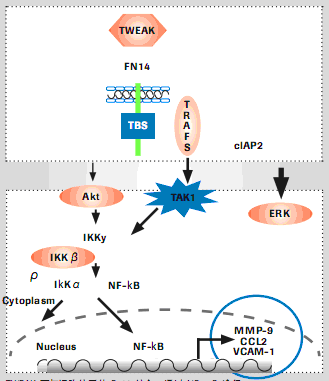 TWEAK(腫瘤壞死因子樣細(xì)胞凋亡弱誘導(dǎo)因子)是一種多功能細(xì)胞因子,可控制包括細(xì)胞增殖、遷移、分化、凋亡、血管生成,以及炎癥在內(nèi)的多種細(xì)胞活動(dòng)。TWEAK通過與Fn14結(jié)合發(fā)揮作用,F(xiàn)n14 是一種具有高度誘導(dǎo)性的細(xì)胞表面受體,與包括細(xì)胞核因子- kB(NF-kB)途徑在內(nèi)的多種細(xì)胞內(nèi)信號途徑具有相關(guān)性(2)。