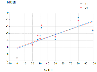 圖 3:細(xì)胞系中反應(yīng)性預(yù)測生物標(biāo)志物 1 基因表達(dá)與體內(nèi)腫瘤生長抑制(TGI)結(jié)果之間相關(guān)性較高。 RealTime ready NF-κB 定制型多孔檢測板中基因表達(dá)結(jié)果與體內(nèi) TGI 作圖!吧飿(biāo)志物1”基因表達(dá)增加與 TGI 具有相關(guān)性。 |
