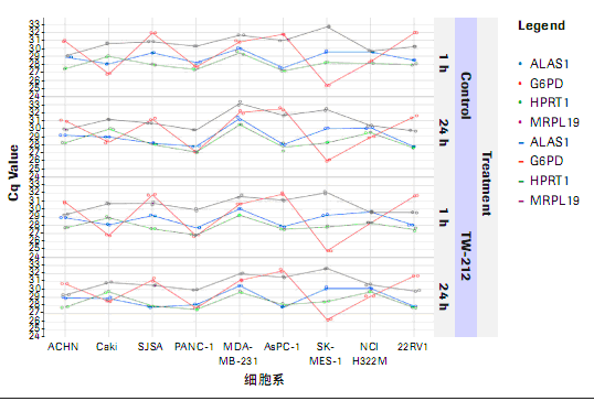 圖 1:9 種細(xì)胞系 4 種參考基因表達(dá)分析。 本研究 9 種細(xì)胞系 4 種參考基因絕對Cq值(重復(fù)檢測)作圖。使用同樣cDNA混合液進(jìn)行PCR。分析 顯示,兩個(gè)參考基因模式相似,參考基因?yàn)椋篈LAS1 (氨基酮戊酸鹽、Δ-、合成酶 1)與 HPRT(次黃嘌呤磷酸核糖轉(zhuǎn)移酶 1)。第 3 個(gè)基因:MRPL19(線粒體核糖體蛋白 L19)性能非常具有可比性,第 4 個(gè)基因:G6PDH(葡萄糖-6-磷酸脫氫酶),具有獨(dú)特模式。因此,我們將 ALAS1 與 HPRT 作為參考基因,進(jìn)行相關(guān)基因表達(dá)分析。 |