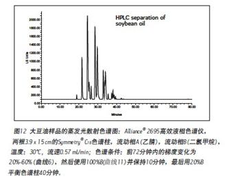 不使用鹵代溶劑做流動相的普通高效液相色譜法很難分離植物油的主要組分——甘油三酸酯。圖12為普通高效液相色譜法(2根5μm粒徑顆粒填充的150mm長的C18柱,蒸發(fā)光散射檢測器ELSD)得到的大豆油的典型色譜圖,使用乙腈和二氯甲烷作為流動相,實現(xiàn)該分離需要60多分鐘。由于二氯甲烷在240nm以內(nèi)具有紫外吸收,這會干擾甘油三酸酯的紫外吸收(最大波長吸收值約210nm),因此使用蒸發(fā)光散射檢測器(ELSD)進(jìn)行檢測。