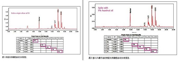 昂貴的特級天然橄欖油通常會被摻入廉價橄欖油和其它植物油(例如大豆油和榛子油)。圖19為一份特級天然橄欖油B的報告。所有指示峰均表明該特級天然橄欖油B未通過根據(jù)特級天然橄欖油A制定的質(zhì)控標(biāo)準(zhǔn)。在該色譜圖中存在保留時間<13.6 min的額外峰,這些數(shù)據(jù)清楚地表明兩種品牌的橄欖油樣品存在差異,并證實并非所有市售的特級天然橄欖油的品質(zhì)都相同。圖20為一份摻入9%榛子油的特級天然橄欖油A的報告。所有指示峰均表明該摻假樣品不符合質(zhì)控標(biāo)準(zhǔn)。而且,根據(jù)特級天然橄欖油A制定的同一質(zhì)控標(biāo)準(zhǔn)也應(yīng)用于分析其它植物油(圖14-16),同樣摻入1%大豆油或1%玉米油的特級天然橄欖油A,均不合格。