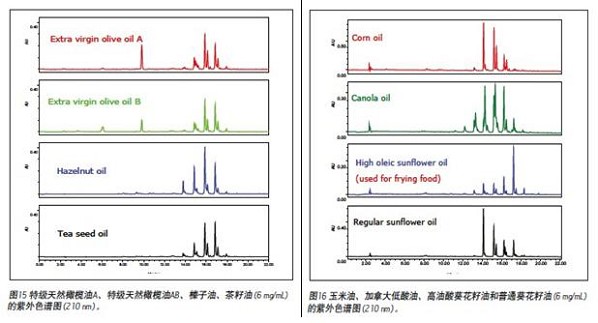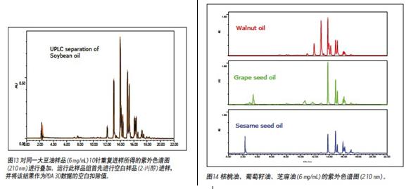 ACQUITY UPLC系統(tǒng)的設(shè)計特點是使用小顆粒裝填技術(shù)的高效色譜柱,以進(jìn)行更快速、更靈敏和更高分離度的分離。UPLC的溶劑傳送系統(tǒng)能承受高達(dá)15,000 psi的背壓,因此能夠使用2-丙醇等高黏度溶劑進(jìn)行植物油分析。由于2-丙醇對植物油的溶解性好12、低毒,透射度限制低,便于對甘油三酸酯進(jìn)行紫外檢測,因此2-丙醇被選作強(qiáng)洗脫液。圖13為關(guān)于同一大豆油樣品的10張疊加的紫外色譜圖說明UPLC法的重現(xiàn)性,此分離使用1.7μm粒徑的2.1 x 150mm的 BEH C18色譜柱,乙腈/2-丙醇作為流動相,整個運行時間縮短為22分鐘。圖12和圖13比較,具有相似的甘油三酸酯峰型,但UPLC法具有更高的分離度,更短的運行時間。數(shù)據(jù)表明不使用致癌溶劑作為流動相,使用 UPLC分離植物油中的組分具有明顯優(yōu)勢。用于植物油分析的乙腈/2-丙醇流動相的UPLC系統(tǒng)可使用PDA、ELSD和MS檢測器,不像其他用于普通高效液相色譜法的溶劑。一次進(jìn)樣便可得到多種數(shù)據(jù)類型,并可以產(chǎn)生可重現(xiàn)的指紋圖譜數(shù)據(jù)7,通過質(zhì)譜法鑒別甘油三酸酯組分10,并用PDA多波長掃描測定植物油的氧化程度8。目前已知植物油具有特征的甘油三酸酯比,這對植物油指紋圖譜5-8的鑒別很有用。如圖14-16所示,核桃油、葡萄籽油、芝麻油、特級天然橄欖油A、特級天然橄欖油B、榛子油、茶籽油、玉米油、加拿大低酸油、高油酸葵花籽油和普通葵花籽油的紫外色譜圖證實,每種油樣品都具有獨特的色譜類型,即相對峰強(qiáng)度。