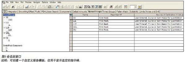 3. 分別將OOO、3L、2LO、2OL和IS從“單峰組分”拖至各自相應(yīng)的命名組中,如圖9所示。創(chuàng)建合格或不合格報告模板的步驟: