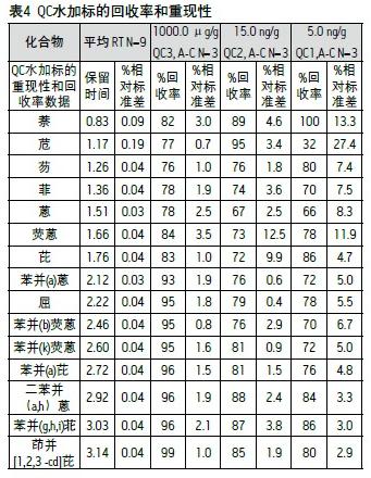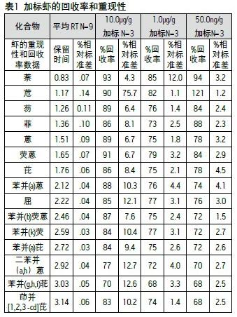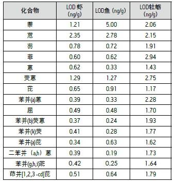 是根據(jù)7份各種海產(chǎn)品基質(zhì)按5 ng/g的濃度加標(biāo)后估算出的檢測(cè)限,計(jì)算依據(jù)為US EPA 40 CFR,附錄B至第136部分,修訂號(hào)1.15.應(yīng)用說(shuō)明證實(shí)了DisQuE基質(zhì)分散樣品制備試劑盒和液相熒光色譜法的組合能夠提供一種適合海產(chǎn)品中PAH檢測(cè)的快速篩選工具。