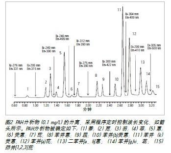 利用ACQUITY UPLC H-Class系統(tǒng),在短短的3.5分鐘內(nèi)就將被US EPA列為重點(diǎn)污染物的15種熒光PAHs分離出來(lái)了。分析物的分離如圖2所示,箭頭所指向的是程序定時(shí)控制波長(zhǎng)的變化。