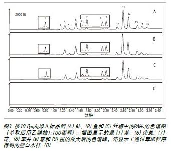 圖3所示為以10μg/g的濃度加標(biāo)的蝦、魚和牡蠣基質(zhì)的色譜圖實(shí)例。如圖3D中所示,同樣通過(guò)樣品制備程序制備出的空白水樣顯示了非常清晰的色譜圖。本樣品制備程序中使用的未加標(biāo)型海產(chǎn)食品基質(zhì)的實(shí)例同樣未見(jiàn)基質(zhì)干擾,如圖4所示。