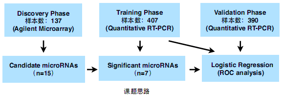 隨后科學(xué)家們利用RT-PCR的方法對(duì)這15個(gè)microRNA進(jìn)行驗(yàn)證分析,從中篩選出7個(gè)確定差異表達(dá)的microRNA。并利用407份樣品的RT-PCR數(shù)據(jù)建立起了一個(gè)多指標(biāo)的logis>c回歸分析模型,用以區(qū)分肝癌患者和其它對(duì)照人群。最后科學(xué)家們又利用390份樣品對(duì)建立好的診斷模型進(jìn)行驗(yàn)證。該模型區(qū)分肝癌患者和正常人群的正確率能達(dá)到94.1%。這項(xiàng)研究成果對(duì)于肝癌的早期診斷和治療有重大意義。