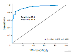 | Receiver operating characteristic (ROC) 曲線分析肝癌患者與正常人群之間該組microRNA的表達(dá)差異,AUC值為0.941。 |