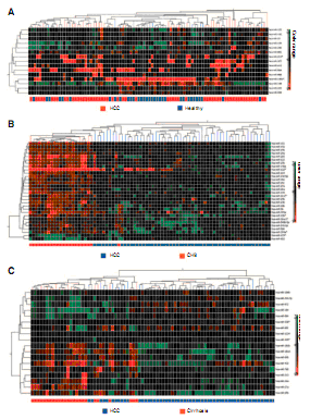 科學(xué)家們首先使用microRNA芯片對(duì)比肝癌患者VS正常人群,肝癌患者VS慢性乙型肝炎(chronic hepatitis B,CHB)患者,肝癌患者VS肝硬化(cirrhosis)患者血清血漿microRNA的表達(dá)譜。結(jié)果篩選出15個(gè)明顯差異表達(dá)的microRNA。