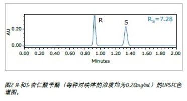 圖1所示的杏仁酸芐酯是一種重要的藥物合成中間體。R-和S-杏仁酸芐酯的外消旋混合物(每種對(duì)映體溶于甲醇后的濃度均為0.20 mg/mL)使用ACQUITY UPSFC系統(tǒng)進(jìn)行分離,其色譜圖如圖2所示。主要試驗(yàn)參數(shù)在表1中列出。