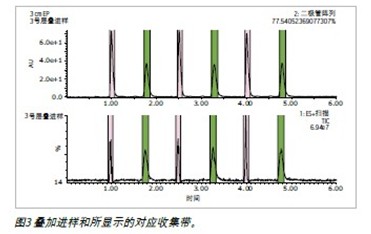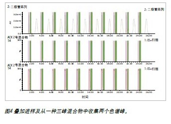 圖3顯示了對(duì)一種雙峰混合物進(jìn)行疊加進(jìn)樣后得出的典型色譜圖。紫外和質(zhì)譜對(duì)所需物質(zhì)的檢測(cè)結(jié)果均是正確的,從而確保了通過紫外或質(zhì)譜觸發(fā)可進(jìn)行可靠而成功的餾分收集。在本例中,紫外信號(hào)用作收集觸發(fā);必要時(shí)也可使用質(zhì)譜信號(hào)。