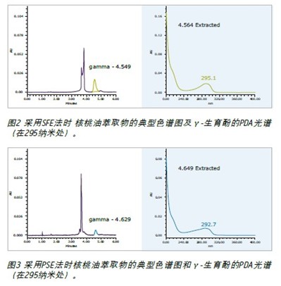 圖2和圖3分別為核桃油萃取物的典型色譜圖和SFE和PSE的PDA光譜。