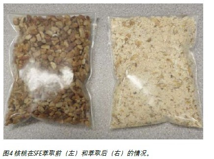 由于干燥時間減少和溶劑處理成本降低,SF E法還節(jié)約了其他方面的成本。相比PSE技術(shù)要蒸發(fā)280毫升溶劑,SFE技術(shù)只需蒸發(fā)20毫升溶劑,需時較少。對于兩者中任一流程,分析之前基本不需要任何樣品處理,同時分析也簡單、快速(40分鐘)。圖4 顯示的是在SFE萃取前和萃取后核桃的情況。顏色變化是由于在萃取過程中去掉了油的原因。