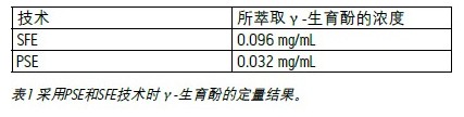 表1 顯示了對于每種技術(shù)γ-生育酚的定量結(jié)果。對照校正曲線分析時,SFE萃取了0.096 mg/mL,而PSE萃取了0.032 mg/mL。