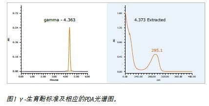 從核桃中萃取油以后,收集溶劑(SFE和PSE分別為20mL和280mL)被去掉,然后測試剩余油中的γ-生育酚。圖1 所示為γ-生育酚標(biāo)準品在SunFire Prep Silica色譜上的梯度洗脫(根據(jù)上述條件)及其相應(yīng)的PDA光譜。通過SFC質(zhì)譜實現(xiàn)了良好的鑒定,采用APCI+ 模式在417.5(γ-生育酚的中波 = 416.69)這一點上產(chǎn)生了強信號(數(shù)據(jù)未顯示)。
