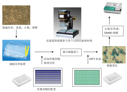 該方法已廣泛用于一些生物活性因子的活性檢測(cè)、大規(guī)模的抗腫瘤藥物篩選、細(xì)胞毒性試驗(yàn)以及腫瘤放射敏感性測(cè)定等,是廣被認(rèn)可的測(cè)試方法。其主要的誤差來(lái)源于MTT 以及DMSO添加的量,反應(yīng)時(shí)間的差異。高通量移液器能有效消除這些差異,讓實(shí)驗(yàn)數(shù)據(jù)真正反映了藥物對(duì)于細(xì)胞的影響,必能讓本方法更好的服務(wù)于生命科學(xué)特別是藥物開(kāi)發(fā)方面的研究。
