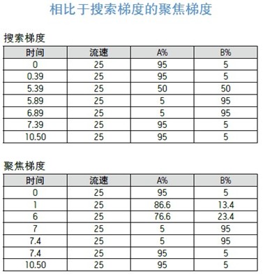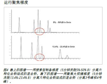 旨在分離梯度中部洗脫時間接近的色譜峰的聚焦梯度應(yīng)開始于原始小規(guī)模試驗條件,通常為0-5% B。進樣開始后立即將梯度快速增加至比能洗脫目標峰的預(yù)期乙腈百分比濃度低5%的乙腈百分比。在搜索梯度中所用的1/5斜率下繼續(xù)進行緩的聚焦梯度部分。預(yù)計一個五倍的更緩梯度可為洗脫時間接近的色譜峰提供更高的分離度。終止高出可洗脫目標峰的預(yù)期乙腈百分比濃度5%的聚焦梯度部分。原始梯度在5分鐘內(nèi)洗脫5-50% B,或者說在5分鐘內(nèi)梯度變化45%。這樣,乙腈濃度每分鐘變化9%(從9%-10%左右簡化得到)。然后,新的梯度斜率應(yīng)為10%的1/5,或者說每分鐘變化2%。10%的乙腈濃度改變通過每分鐘變化2%而達到,說明用于分離3號和4號峰的聚焦梯度時間片段應(yīng)持續(xù)5分鐘。一旦梯度的聚焦部分完成,乙腈百分比快速增加至95% B,以清洗色譜柱。平衡色譜柱后,終止初始條件下的梯度。5-45% B = 每分鐘9%(舍入至每分鐘10%)梯度斜率每分鐘變化2%。
