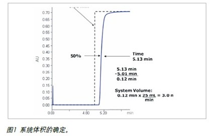 系統(tǒng)體積被定義為從梯度形成點到色譜柱前端的體積。系統(tǒng)體積用于聚焦梯度的設(shè)計。如圖1所示,本試驗所用儀器配置下的系統(tǒng)體積是3.0 mL。