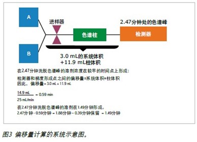 在2.47分鐘洗脫3號色譜峰的溶劑濃度在較早的時間點上形成。如圖3所示,檢測器和梯度形成點之間的偏移量等于系統(tǒng)體積加上柱體積。用于這臺特定系統(tǒng)的偏移量等于早期確定的3 mL系統(tǒng)體積再加上19 x 50 mm制備柱的體積(11.9 mL),即14.9 mL。在25 mL/分鐘的流速下,溶劑濃度到達檢測器需要0.59分鐘。2.47分鐘的洗脫時間減去0.59分鐘的偏移時間等于1.88分鐘。由于初始大規(guī)模梯度有0.39分鐘的保留時間,因此形成洗脫色譜峰的乙腈百分比的時間是1.88分鐘減去0.39分鐘,即1.49分鐘。