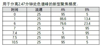 聚焦梯度可明顯提高圖4所示色譜圖中3號峰和4號峰的分離度。5號峰和6號峰因受到梯度聚焦部分的影響而出現(xiàn)移位,梯度部分繼續(xù)在較緩的斜率下洗脫化合物,直至設(shè)定用于進行柱清洗的較高百分比的乙腈進入色譜柱。較緩的聚焦梯度能在不增加運行時間的情況下對天然混合組分提供更高的分離度,因而使色譜分析師能夠獲得更純的產(chǎn)物和更好的回收率。