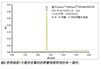 作為系統(tǒng)功能的最終確認(rèn),收集自野葛根提取物的餾份使用一臺分析型HPLC系統(tǒng)進(jìn)行了再分析,如圖6所示。結(jié)果顯示分離和收集到野葛根的純凈單峰,這可用于后續(xù)的研發(fā)步驟。