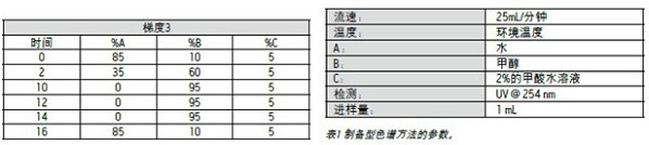 制備型HPLC分析使用一臺由沃特世2545型四元梯度模塊、2489型紫外/可見光檢測器、制備型色譜架以及基于SunFire Prep C18 OBD柱(5 μm、19 x 100 mm)的餾份收集器III組成的系統(tǒng)。整臺系統(tǒng)使用同時配備FractionLynx和開放操作型應(yīng)用管理程序的MassLynx軟件進(jìn)行控制。表1概述了方法參數(shù)、流動相組分和梯度條件,如第3頁所示。