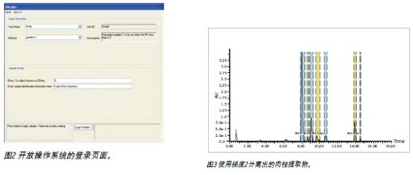 為進(jìn)一步精簡HPLC純化過程,僅使用開放操作系統(tǒng)的登錄頁面即可簡化方法的選擇,如圖2所示。勾選登錄按鈕后,用戶可通過手動進(jìn)樣器簡單實現(xiàn)進(jìn)樣。檢測運行完成后,結(jié)果可被打印出來或電郵發(fā)送給用戶。這些梯度旨在確保即使用戶選擇了一種欠佳的方法,所有潛在的目標(biāo)化合物也能從柱上被洗脫下來并得到收集。關(guān)于這一點的一個示例可參見圖3,該色譜圖顯示了使用梯度2分離出的肉桂提取物。兩種洗脫時間非常晚的化合物在薄層色譜目標(biāo)化合物之后較長時間才得到收集。