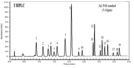 但傳統(tǒng)的LC分析方法通常耗時(shí)較長(zhǎng),消耗溶劑及產(chǎn)生的有害廢液也較多,比如HPLC分析19種PAHs一般需20min,同時(shí)需消耗25mL左右的乙腈。然而通過(guò)PerkinElmer開(kāi)發(fā)的超高液相色譜(UHPLC)結(jié)合2μm填料顆粒的色譜柱分析這19種PAHs,分析時(shí)間僅需約4min,且可降低約90%的流動(dòng)相溶劑(乙腈)的消耗。