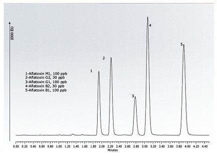 這些化合物具有毒性,可對人類和動(dòng)物產(chǎn)生致癌作用。B1和G1是四種天然產(chǎn)生的毒素中毒性最大的兩種。由于其毒性強(qiáng),政府法規(guī)部門對食品中黃曲霉毒素的含量進(jìn)行了嚴(yán)格的限制。因此,食品行業(yè)需要靈敏、精確且重現(xiàn)性良好的分析方法對這些物質(zhì)進(jìn)行檢測。這些方法通;诜聪郒PLC色譜分離和熒光檢測。但是,由于反相洗脫會(huì)使黃曲霉毒素B1和G1的熒光效應(yīng)發(fā)生猝滅,通過使用衍生化以增強(qiáng)這些待測物的反應(yīng)。常規(guī)檢測是使用三氟乙酸(TFA)進(jìn)行柱前衍生以及采用碘法、電化學(xué)衍生溴法或光化學(xué)UV衍生法的柱后衍生。