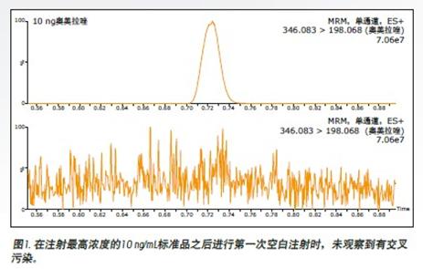 Xevo TQ-S是具有高靈敏度的用于LC/MS/MS分析的質(zhì)譜儀。它需要一個(gè)能夠解決交叉污染問(wèn)題的UPLC® 入口,以與該儀器寬泛的線性動(dòng)態(tài)范圍相匹配。ACQUITY UPLC I-Class系統(tǒng)可選用兩種樣品管理器:固定定量環(huán)(SM-FL)或流通針式(SM-FTN)進(jìn)樣器,這兩者在設(shè)計(jì)上均能實(shí)現(xiàn)良好的抗交叉污染性能。在分析奧美拉唑時(shí),采用SM-FTN設(shè)計(jì)。該種類型的進(jìn)樣器,在分析過(guò)程中,以移動(dòng)相(梯度)沖洗針頭內(nèi)部。在進(jìn)樣口,F(xiàn)TN采用單種溶劑清洗針頭外部,且在設(shè)計(jì)上能夠?qū)崿F(xiàn)防止清洗溶液與樣品或流動(dòng)相接觸。在密封面同時(shí)清洗針頭以及密封墊可減少污染幾率。清洗程序已編入本方法中,且可設(shè)置為在進(jìn)樣之前以及進(jìn)樣之后清洗。清洗溶劑的組成取決于樣品,且其必須能夠很容易地溶解分析物。對(duì)于pKa為8.8的奧美拉唑來(lái)說(shuō),可采用含有氫氧化銨的清洗溶劑來(lái)清洗注射器。此外,當(dāng)將氫氧化銨用于流動(dòng)相時(shí),系統(tǒng)的交叉污染將更低。在堿性條件下,可使奧美拉唑的離子化效率進(jìn)一步提高。為評(píng)估交叉污染,向色譜柱注射具最高濃度(10 ng/mL或10 pg)的標(biāo)準(zhǔn)品。如圖1所示,在注射最高濃度標(biāo)準(zhǔn)品之后首次進(jìn)行空白注射時(shí),未觀察到有交叉污染。