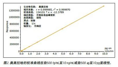 基于校準(zhǔn)曲線,確定樣品殘留量低于0.0005%,而這低于質(zhì)譜的檢測(cè)下限。如圖2所示,在500 ag至10 pg范圍內(nèi),采用1/x權(quán)重系數(shù),可獲得相關(guān)系數(shù)為0.99997的線性,這足以證實(shí)可在與Xevo TQ-S連用的ACQUITY UPLC I-Class系統(tǒng)上對(duì)奧美拉唑進(jìn)行線性校準(zhǔn)。