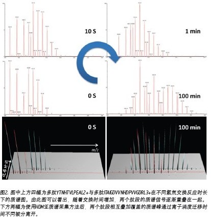 氫氘交換實驗的質(zhì)譜數(shù)據(jù)中,隨著交換時間的延長,發(fā)生了交換反應(yīng)的多肽,由于質(zhì)量變大,其質(zhì)譜信號將逐漸向高質(zhì)荷比方向移動。因此,這些質(zhì)譜峰可能與哪些未發(fā)生交換反應(yīng)的多肽質(zhì)譜峰逐漸疊加、相互覆蓋。相互疊加的質(zhì)譜信號,不但影響對峰歸屬的判斷,更會增加交換率數(shù)據(jù)的誤差。因為交換率判斷需要通過對發(fā)生交換的多肽進行定量,毫無疑問因疊加的而混亂的質(zhì)譜數(shù)據(jù)將極大的影響對質(zhì)譜峰的準(zhǔn)確定量。這點對于單純通過質(zhì)荷比進行分析的質(zhì)譜儀來說完全無能為力。但是,這個看似不可能完成的任務(wù)卻被沃特世 nanoACQUITY UPLC HD-Exchange System攻克了。這是因為,不同于其它常見質(zhì)譜,沃特世的SYNAPT®質(zhì)譜平臺還具備根據(jù)離子大小及形態(tài)進行分離的功能(行波離子淌度分離)。在數(shù)據(jù)處理時,除多肽離子的質(zhì)荷比信息外,還可以通過離子遷移時間(離子淌度維度參數(shù))將不同離子區(qū)分。因此這種SYNPAT獨有的被命名為HDMSE的質(zhì)譜分析技術(shù)可以將因質(zhì)荷比相同而重疊的多肽分離開,輕而易舉地解決了質(zhì)譜信號疊加的問題,得到準(zhǔn)確的交換率數(shù)據(jù)[11,12](圖2)。SYNPAT質(zhì)譜平臺一經(jīng)推出就奪得了2007年P(guān)ITTCON金獎,目前已經(jīng)推出了新一代的SYNAPT G2HDMS、SYNAPT G2-S HDMS等型號,并具備ESI、MALDI等多種離子源。除氫氘交換技術(shù)外,SYNAPT質(zhì)譜系統(tǒng)在蛋白質(zhì)復(fù)合體結(jié)構(gòu)研究中也是獨具特色,已有多篇高質(zhì)量應(yīng)用文獻發(fā)表[13,14,15]。