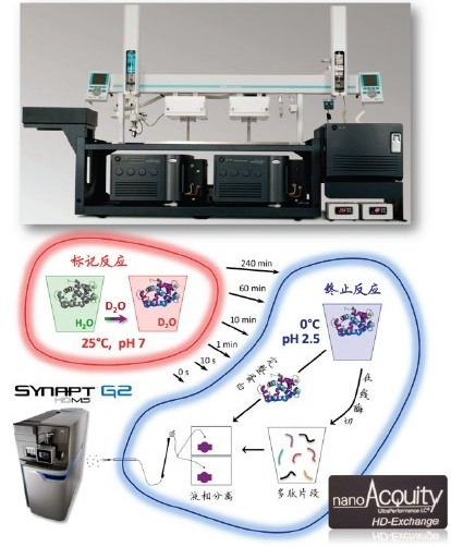 與經(jīng)典的蛋白質(zhì)結(jié)構(gòu)研究方法相比,如X射線晶體衍射(X-Ray Crystallography)和核磁共振(NMR. Nuclear Magnetic Resonance)等方法,氫氘交換質(zhì)譜不能夠提供精確的蛋白空間結(jié)構(gòu),它直接提供的主要信息包括哪些氨基酸序列位于蛋白質(zhì)空間結(jié)構(gòu)的表面位置(包括動態(tài)變化中的)、可能的活性位點和蛋白-蛋白相互作用位點等。但是氫氘交換質(zhì)譜技術(shù)有著其他經(jīng)典方法不具備的優(yōu)點:首先,可以進行蛋白質(zhì)結(jié)構(gòu)動態(tài)變化的研究是氫氘交換質(zhì)譜的一個突出優(yōu)點,包括變化中的活性位點及表位;其次,氫氘交換質(zhì)譜在蛋白復(fù)合體構(gòu)象的研究中也具有獨到的優(yōu)勢;此外,氫氘交換質(zhì)譜還具有對樣品需求量小、純度要求相對較低、研究對象為溶液環(huán)境下的蛋白質(zhì)的天然構(gòu)象而非晶體中構(gòu)象等優(yōu)勢[1,4,5]。自1991年第一篇研究論文發(fā)表起,氫氘交換質(zhì)譜技術(shù)不斷發(fā)展,已經(jīng)成為結(jié)構(gòu)生物學(xué)及質(zhì)譜技術(shù)中一個非常重要的應(yīng)用領(lǐng)域[6]。但是氫氘交換質(zhì)譜實驗的復(fù)雜的實現(xiàn)過程在一定程度上影響了其應(yīng)用的廣泛度。主要的難點有:1、如何避免交換后氘代肽段的回交現(xiàn)象;2、實驗控制的高精確性和重現(xiàn)性要求;3、交換后造成的疊加的質(zhì)譜峰如何準(zhǔn)確分辨;4、簡易高效的分析軟件需求;5、以氨基酸為單位的交換位點辨析。沃特世公司自2005年起,針對以上難點不斷進行攻關(guān),推出了目前唯一商業(yè)化的全自動氫氘交換質(zhì)譜系統(tǒng)解決方案——nanoACQUITY UPLC® HD-Exchange System(圖1)。在全世界范圍內(nèi),這套系統(tǒng)已經(jīng)幫助科學(xué)家在包括Cell、Nature等頂級研究期刊中發(fā)表研究論文[7,8]。除科研需求外,沃特世氫氘交換質(zhì)譜系統(tǒng)也受到眾多國際領(lǐng)先制藥公司的認(rèn)可,并用于新藥開發(fā)中蛋白藥物活性位點及表位的研究工作中。