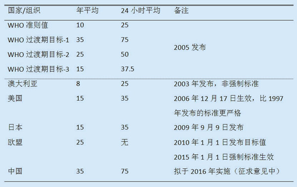 世界衛(wèi)生組織(WHO)和一些國(guó)家的PM2.5標(biāo)準(zhǔn)(單位:微克/立方米)