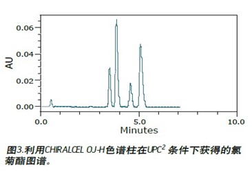 圖3顯示了利用ACQUITY UPC2系統(tǒng)對氯菊酯進(jìn)行非對映體分離。所有四種異構(gòu)體利用更短的OJ-H色譜柱在不足6分鐘內(nèi)實(shí)現(xiàn)了基線分離。實(shí)驗(yàn)結(jié)果總結(jié)于表2中?偟膩碚f,與手性HPLC方法相比,當(dāng)前的UPC2方法實(shí)現(xiàn)了更好的分離,且運(yùn)行時(shí)間更短。