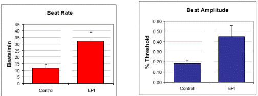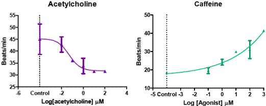 我們采用經(jīng)典陽性藥物異丙腎上腺素、腎上腺素、咖啡因作為刺激劑,用已知的心肌細胞抑制劑乙酰膽堿來進行心肌跳動模式的檢測和心肌跳動分析模塊的功能。