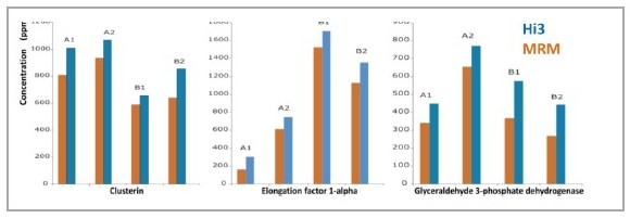 融合抗體anti-phosphotyrosine IgG 1 (PTG1 mAb)使用中國倉鼠卵巢細(xì)胞系DG-44 CHO在兩種培養(yǎng)條件下表達(dá),表達(dá)后的PTG1 mAb再分別使用A、B兩種方法純化。經(jīng)過2D-UPLC MSE方法采集液質(zhì)數(shù)據(jù)后,使用PLGS軟件分析[3]。在分析結(jié)果中,可以明確地給出鑒定到樣品中含有的雜質(zhì)蛋白,以及給出這些雜質(zhì)蛋白的相對含量結(jié)果(圖1)。為了驗證Hi3定量方法的可靠性,使用MRM方法對以上實驗結(jié)果中Clusterin、Elongation factor 1-alpha、Glyceraldehyde 3-phosphate dehydrogenase三個蛋白進(jìn)行了定量驗證。通過Hi3與MRM兩種定量方法結(jié)果對比,可以發(fā)現(xiàn)兩者定量濃度非常接近(圖2)。在使用PLGS進(jìn)行樣品中的雜質(zhì)蛋白鑒定與定量分析中,檢索方法設(shè)置與肽圖分析幾乎一致,只增加將參考蛋白的名稱與濃度列入分析參數(shù)一步。之后,所有的分析過程都將由PLGS自行完成,并直接給出蛋白鑒定身份與濃度的結(jié)果列表。實際上PLGS不僅使用在生物藥雜質(zhì)蛋白分析中,在樣品極為復(fù)雜的蛋白質(zhì)組學(xué)研究中,Hi3