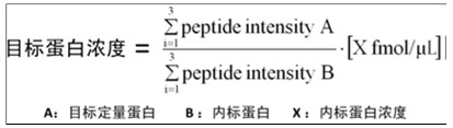 如果想得到樣品中準(zhǔn)確的蛋白絕對濃度信息,也非常簡單。只需在樣品中加入一個已知的蛋白內(nèi)標(biāo)便可。這時Hi3分析方法會根據(jù)內(nèi)標(biāo)蛋白的濃度,按照以下公式,對樣品中的絕對濃度進(jìn)行定量[1,2]。