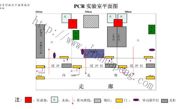 各實(shí)驗區(qū)之間的試劑及樣品傳遞應(yīng)通過傳遞窗進(jìn)行。PCR實(shí)驗室平面布置示意圖如下圖所示。