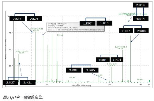 二硫鍵對于蛋白質(zhì)高級結(jié)構(gòu)的形成和功能的維持具有重要的作用,二硫鍵的定位也是蛋白質(zhì)結(jié)構(gòu)分析的重要方面。但是二硫鍵的定位一直很耗時且非常具有挑戰(zhàn)性的事情,尤其是對于含有多對二硫鍵的蛋白質(zhì),如免疫球蛋白等。沃特世公司的肽圖分析完整解決方案通過獨特的UPLC/MSE數(shù)據(jù)采集方式和功能強大的BiopharmaLynx軟件,可以快速地自動完成二硫鍵的定位分析(見圖6)。