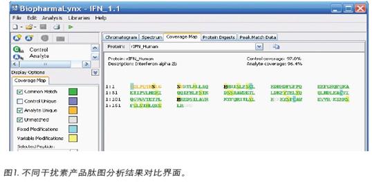 肽圖分析可以確證蛋白質(zhì)分子的一級結(jié)構(gòu),包括氨基酸序列、突變和修飾、二硫鍵定位等。由于酶解后的樣品中同時存在著蛋白質(zhì)的完全酶切肽段、不完全酶切肽段、非特異酶切肽段、修飾肽段和雜蛋白肽段,因此肽圖是非常復(fù)雜的。通過全信息串聯(lián)質(zhì)譜技術(shù)(MSE),可以同時記錄樣品中所有的母離子及其碎片離子信息。在全面信息的基礎(chǔ)上,BiopharmaLynx軟件將可以自動進行保留時間的對齊、強度歸一化、痕量雜質(zhì)分析、序列確證等工作。圖1為BiopharmaLynx軟件對兩種干擾素產(chǎn)品肽圖分析的鑒定覆蓋率分析結(jié)果,及其序列對比界面。