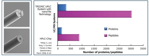 對于痕量樣品的液質分析,往往需要納升級液相(nanoLC)作為分離工具。但是由于納升液相采用極細管路(內(nèi)徑25-100微米),以及極低流速(200-450nL/min)的原因,在nanoLC使用中,微小的操作誤差就會對其分離性能造成巨大影響,甚至導致實驗失敗。圖1(左)顯示了納升毛細管在切割使用中可能存在的問題。為了減小nanoLC的操作難度,沃特世推出了納升微流控芯片——Trizaic。它將眾多的管路與色譜柱整合為一體,在方寸之間實現(xiàn)了nanoLC 的輕松操作。Trizaic作為沃特世的納升級微流控芯片系統(tǒng),以UPLC技術為起點,遠遠超越了其它微流控芯片產(chǎn)品目前的HPLC水平。自然而然,與其它微流控芯片比較,Trizaic天然地具有了UPLC較HPLC的巨大的性能優(yōu)越性。通過兩者的對比, Miller教授于Current Trends in Mass Spectrometry期刊發(fā)表的論文中清晰地顯示出了Trizaic所能提供的,而HPLC級微流控芯片所無法企及的卓越性能(圖1右)。