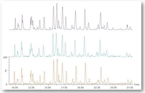 圖3. Enolase蛋白酶切混合物(70fmol)使用Trizaic分離分析。圖中從上至下依次為第15次、215次、475次重復實驗分析色譜圖。結果顯示出了Trizaic優(yōu)秀的重現(xiàn)性和穩(wěn)定性。