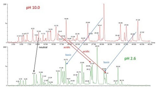 R P-R P雙反相分離技術(shù)在第一、第二維都使用了反相色譜,那么它是如何實(shí)現(xiàn)二維分離所必須的分離性質(zhì)的正交呢?原來(lái),經(jīng)過(guò)研究發(fā)現(xiàn),在不同pH值環(huán)境下,多肽的反相保留行為是不一樣的(圖2)[2]。根據(jù)這個(gè)性質(zhì),沃特世的科學(xué)家開發(fā)出了獨(dú)有的RP-RP納升在線二維系統(tǒng)——nanoACQUITY UPLC® System with 2D-LC。這個(gè)系統(tǒng)的分離柱,使用了UPLC一貫的亞二微米顆粒填料,因此具有了UPLC的超高分離度等優(yōu)點(diǎn)。此外,它還不需要分流就可以實(shí)現(xiàn)精準(zhǔn)的納升流速,可為實(shí)驗(yàn)室節(jié)省巨大的高純度流動(dòng)相購(gòu)買費(fèi)用及廢液處理費(fèi)用,而且更加環(huán)保。nanoACQUITY UPLC System with 2D-LC雙反相二維系統(tǒng)優(yōu)點(diǎn)總結(jié)如下: