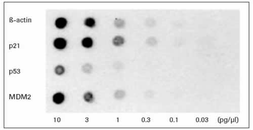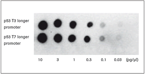 圖2: DIG探針標記反應的靈敏度檢測實驗。顯色條件為羅氏化學發(fā)光試劑CDP-Star,曝光5min。該實驗結(jié)果表明,所有探針(除p53探針)均在0.1pg濃度處檢出。(數(shù)據(jù)來源于Roche Cancer Research Application Note No. 10, Weil et al., June 2011)