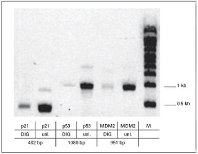 圖1:通過1.2%的瓊脂糖凝膠電泳驗證DIG探針標記反應的有效性。每個泳道的RNA加樣量為100ng。(數(shù)據(jù)來源于Roche Cancer Research Application Note No. 10, Weil et al., June 2011)