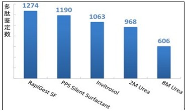圖1. Tris水相緩沖體系下各種變性劑的輔助酶切效果比較。樣品為mammalian cell lysate cytoplasmic fraction蛋白。