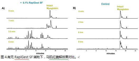 由于其表面活性劑的屬性,RapiGest SF可以非?焖俚貙Φ鞍淄瓿勺冃,從而縮短酶解實驗時間。圖4顯示,RapiGest SF輔助下,完全酶解馬肌紅蛋白只需要5分鐘。而由于肌紅蛋白屬球蛋白,其在不充分變性的情況下將難以酶解。在對照反應(yīng)中,單純與胰蛋白酶孵育條件下,即使到9小時后,仍只有少量的蛋白被酶解;而使用了RapiGest SF試劑的體系,酶解效率顯著提升。
