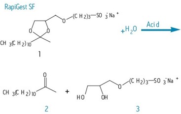 RapiGest SF雖然是一種表面活性劑,但其全面適應(yīng)液質(zhì)分析的要求。在使用RapiGest SF作為變性劑完成蛋白酶切后,如果只進行色譜分析,則可無需對RapiGest SF進行處理。如進行液質(zhì)聯(lián)用分析,則通過簡單的加酸步驟就可將RapiGest SF去除。而酸性溶液環(huán)境又恰恰是液質(zhì)分析所需的樣品溶液環(huán)境。事實上,RapiGest SF是酸性不穩(wěn)定表面活性劑,在酸性條件下(pH2)極易水解。RapiGestSF的結(jié)構(gòu)及其水解產(chǎn)物見圖2。酸化后RapiGest SF降解為兩個產(chǎn)物:2-十二酮和3-羥(2,3-二羥基丙基)丙磺酸鈉。前者與水不能互溶,通過離心去除。后者在水溶液中溶解度很高,在反相LC模式下不保留。因此,酶消解后的水溶液可直接進行LC-MS或MALDI-MS分析。