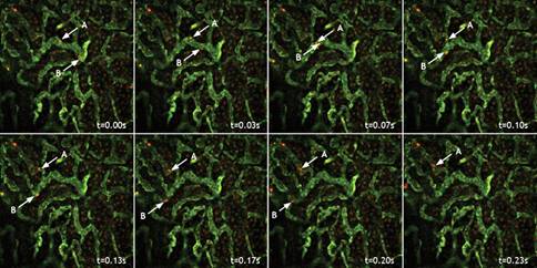實(shí)時(shí)活體腎血流動(dòng)的灌注檢測(cè)也是一個(gè)例子,兩個(gè)通道使用一個(gè)Olympus 20X 1.0 NA物鏡以30幀/秒(512*512分辨率)同時(shí)進(jìn)行圖像采集。血液與葡萄糖(血漿,綠色)和1微米熒光微球的混合物一起灌注。在血管中我們追蹤兩個(gè)獨(dú)立的微球(A和B)。后續(xù)幀之間的高瞬時(shí)分辨率保證了各微球更精確的速度測(cè)量。在綠色的血漿之中我們還可以觀察到一些暗色物體,這些暗色物體是紅細(xì)胞,這樣就為血液流動(dòng)分析提供了額外的依據(jù)。